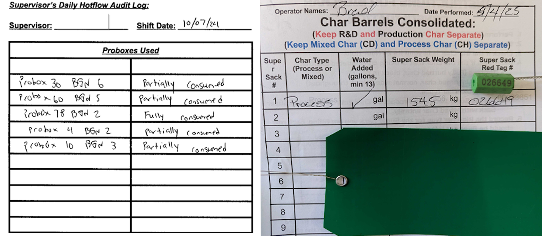 Handwritten biomass consumption logs (left) and char inventory recording (right)